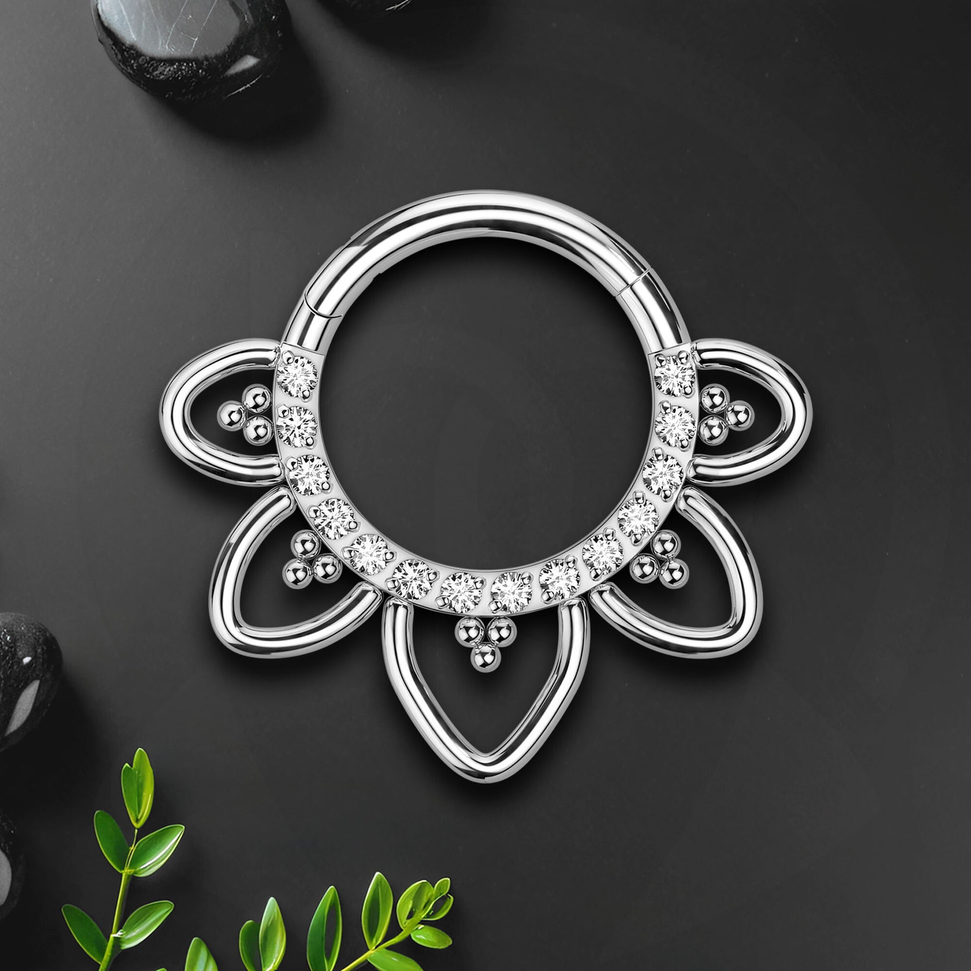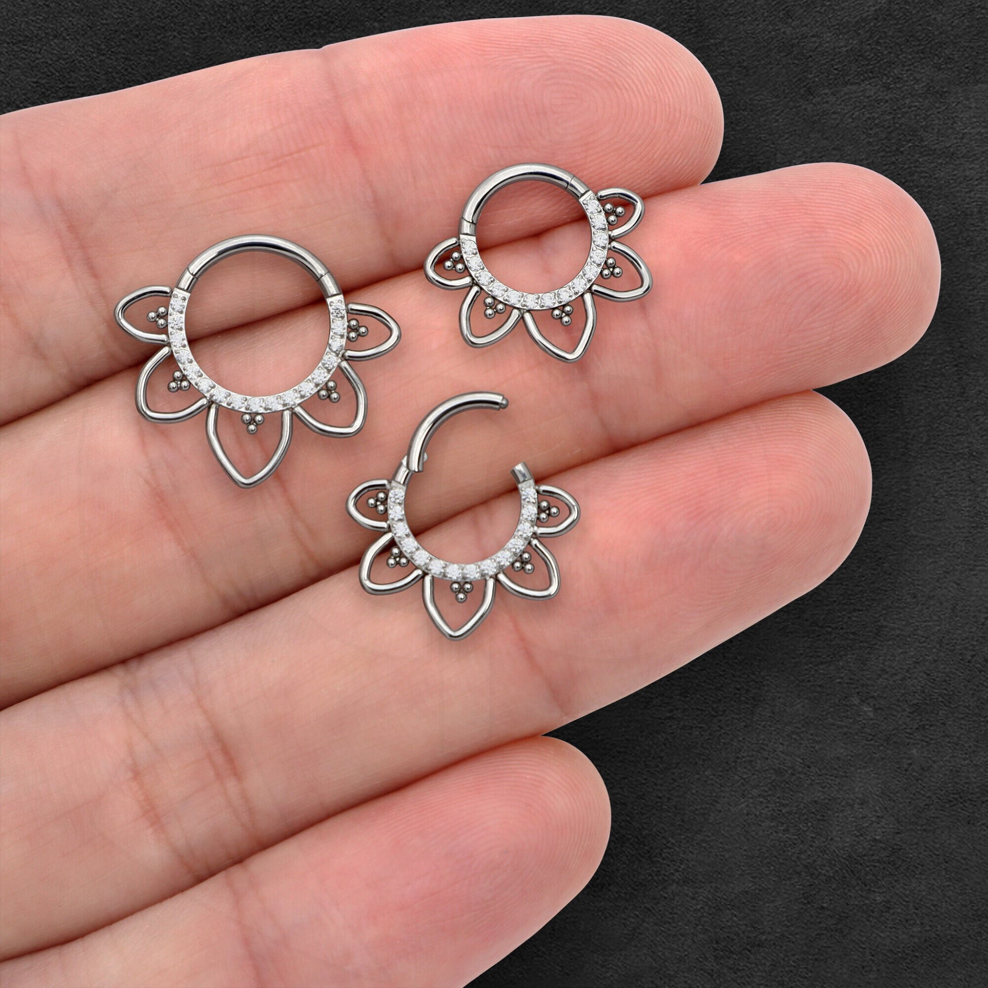 Premium materials like titanium, surgical steel, gold and platinum plating, Swarovski crystals, cubic zirconias, and natural opals.